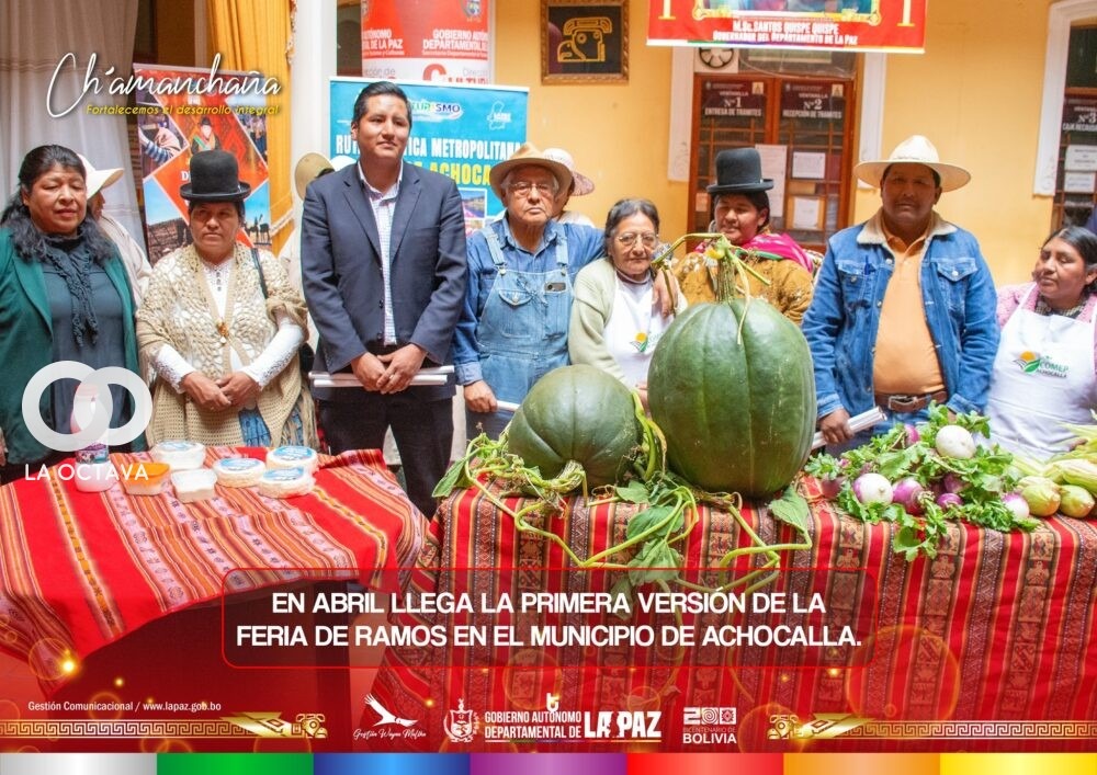 Este jueves 3 de abril, el Gobierno Autónomo Municipal Ecológico Productivo de Achocalla alista la primera versión de la Feria de Ramos, que se llevará a cabo del 12 al 19 de abril. La actividad busca impulsar la economía de la población, mediante la oferta de productos locales como nabo, choclo, acelga, repollo, zapallo, queso, yogurt, entre otras verduras, frutas y tubérculos.