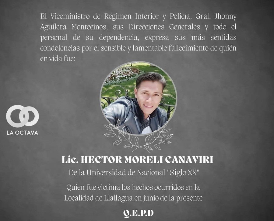 Asimismo, Jhonny Aguilera, Viceministro de Régimen Interior y Policía expresó sus condolencias y destacó el legado de Moreli como líder comprometido con los derechos estudiantiles y el bienestar comunitario. La Policía Boliviana continúa con las investigaciones; hasta ahora hay 13 personas con detención preventiva, incluyendo al alcalde de Llallagua, Adalid Aguilar, por presunta vinculación en los hechos violentos.