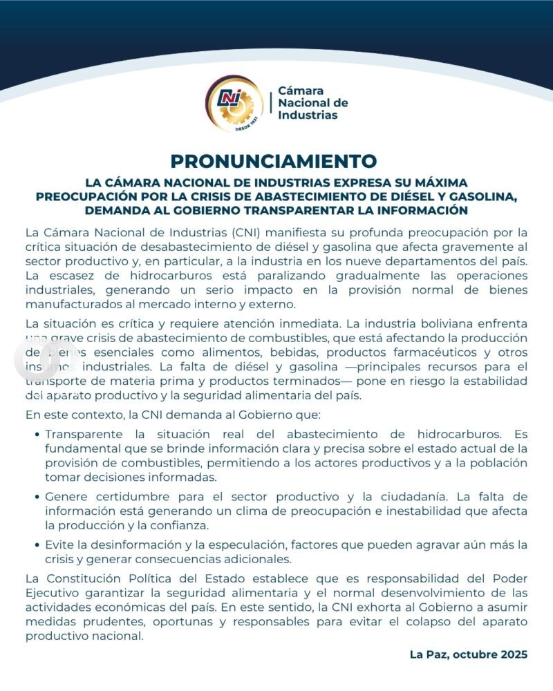 La Cámara Nacional de Industrias (CNI) expresó su profunda preocupación por la crítica escasez de diésel y gasolina que está afectando gravemente al sector productivo en todo el país. La falta de combustibles ha comenzado a paralizar operaciones industriales, poniendo en riesgo la provisión de bienes esenciales al mercado interno y externo, como alimentos, bebidas y productos farmacéuticos.