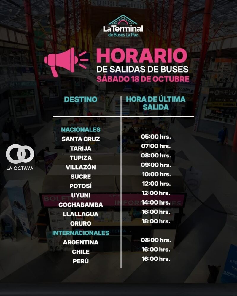 Durante el sábado, la atención en la terminal será de 03:30 a 23:00, pero las salidas estarán limitadas por destino. Los horarios de corte varían: hacia Santa Cruz hasta las 05:00, Sucre hasta las 10:00, y Oruro hasta las 18:00.