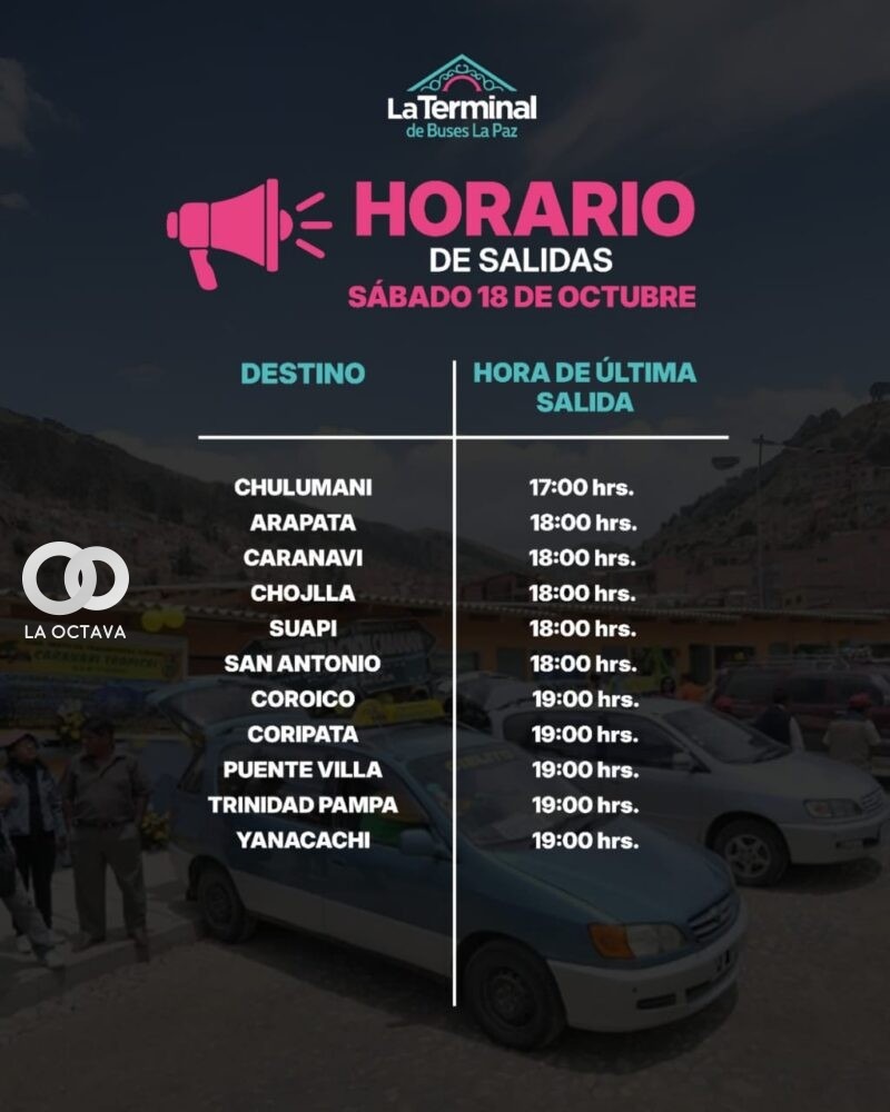 Terminal de Buses La Paz anunció que el último despacho interdepartamental se realizará el sábado 18 de octubre a las 18:00, en cumplimiento del Auto de Buen Gobierno dispuesto para la segunda vuelta electoral del domingo 19. La norma restringe viajes terrestres y aéreos desde la medianoche del viernes 17 hasta el mediodía del lunes 20, salvo excepciones relacionadas con el Órgano Electoral y fuerzas de seguridad.