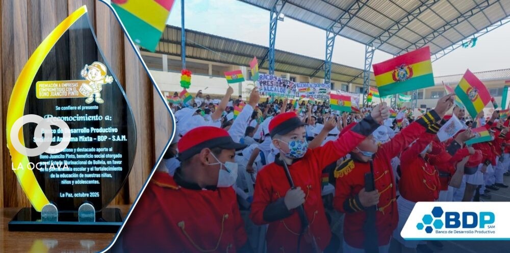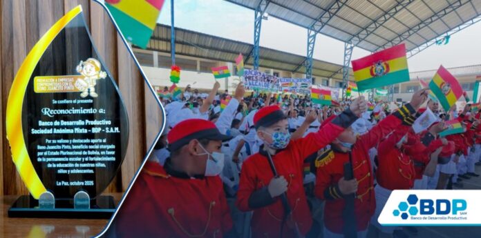 El Banco de Desarrollo Productivo – Sociedad Anónima Mixta (BDP-SAM) fue reconocido por su aporte de Bs2,8 millones al Bono Juancito Pinto, incentivo estatal que beneficia a más de 2,3 millones de estudiantes en todo el país y busca reducir la deserción escolar. El acto oficial contó con la presencia del presidente del Estado Plurinacional de Bolivia y representantes de 27 empresas públicas que contribuyeron al pago del bono.