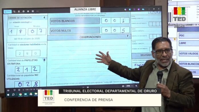 Tribunal Electoral Departamental (TED) de Oruro presentó una denuncia ante el Ministerio Público contra la Alianza Libre por presentar un acta supuestamente alterada durante el balotaje presidencial del domingo 19 de octubre, que dio como ganador a Rodrigo Paz. La denuncia incluye los delitos de falsedad, uso de instrumento falsificado y obstaculización al proceso electoral.