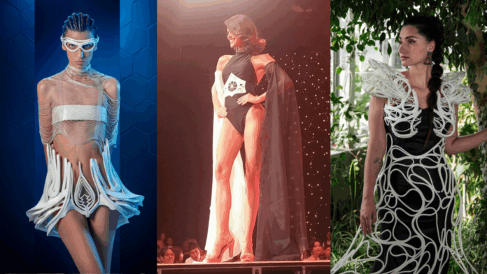 La marca muestra trajes 3D creados con materiales ecoamigables, redefiniendo la moda experimental.