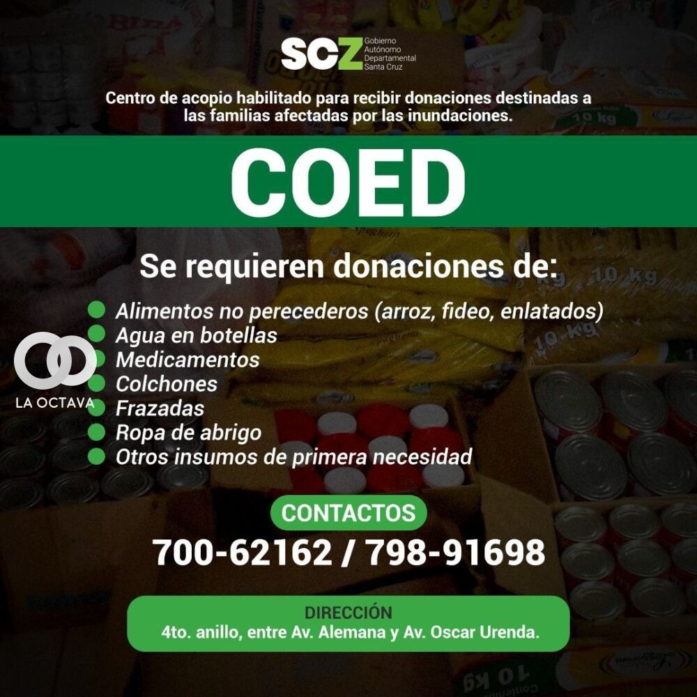 El Centro de Operaciones de Emergencia Departamental (COED) hizo un llamado a la población para donar agua, alimentos, ropa, medicamentos y artículos de primera necesidad para las familias afectadas por las intensas lluvias e inundaciones en Santa Cruz. Los insumos se reciben en las oficinas del COED, ubicadas en el cuarto anillo, entre avenidas Alemana y Óscar Urenda, y los interesados pueden comunicarse a los números 70062162 y 79891698.