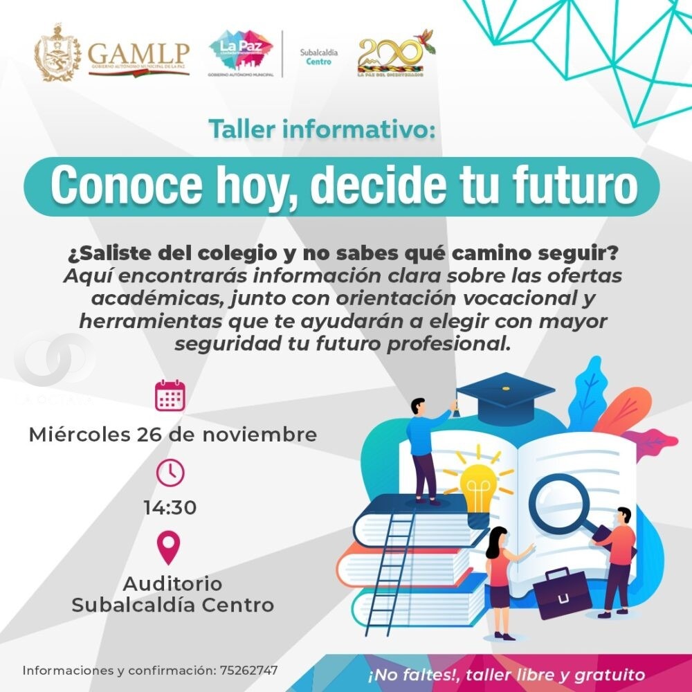 La Subalcaldía Centro de La Paz realizará este miércoles un taller informativo titulado “Conoce hoy, decide tu futuro”, dirigido a jóvenes que terminaron el colegio y aún no han definido su camino profesional. El evento, que será gratuito y abierto al público, se desarrollará a las 14:30 en el Auditorio de la Subalcaldía Centro.