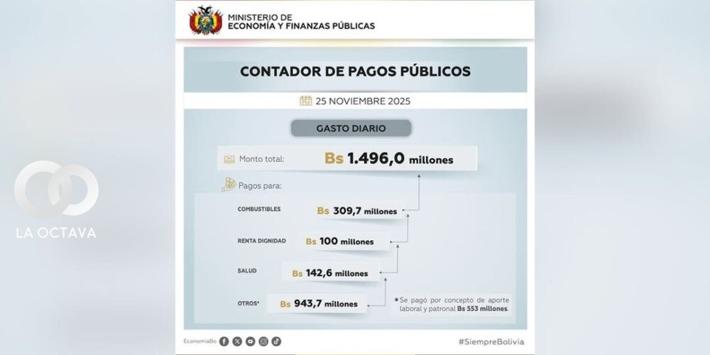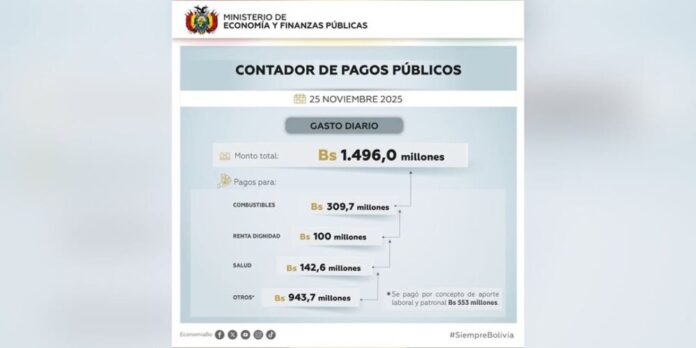 El Ministerio de Economía y Finanzas Públicas difundió este martes el primer reporte del nuevo Contador de Pagos Públicos, herramienta que transparenta en tiempo real el uso de los recursos del Estado. Según el informe del 25 de noviembre, se registraron Bs 1.496 millones en pagos, de los cuales Bs 309,7 millones corresponden a la compra de combustibles, Bs 142,6 millones al sector salud y Bs 100 millones a la Renta Dignidad.