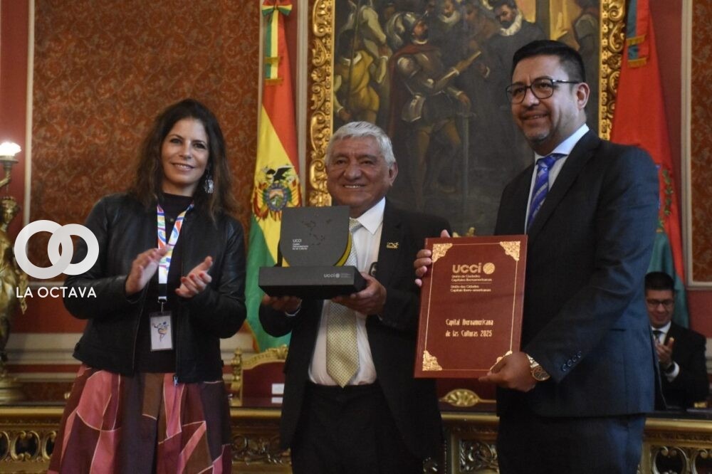 La Paz fue distinguida como Capital Iberoamericana de la Cultura 2025, en un acto oficial donde el alcalde Iván Arias recibió el reconocimiento otorgado por la Unión de Ciudades Capitales Iberoamericanas (UCCI). Asimismo, Luciana Binaghi, Directora general de la entidad, destacó que por primera vez el galardón se entrega a dos ciudades bolivianas —La Paz y Sucre— en reconocimiento a su riqueza cultural, su patrimonio y su aporte al espacio iberoamericano.