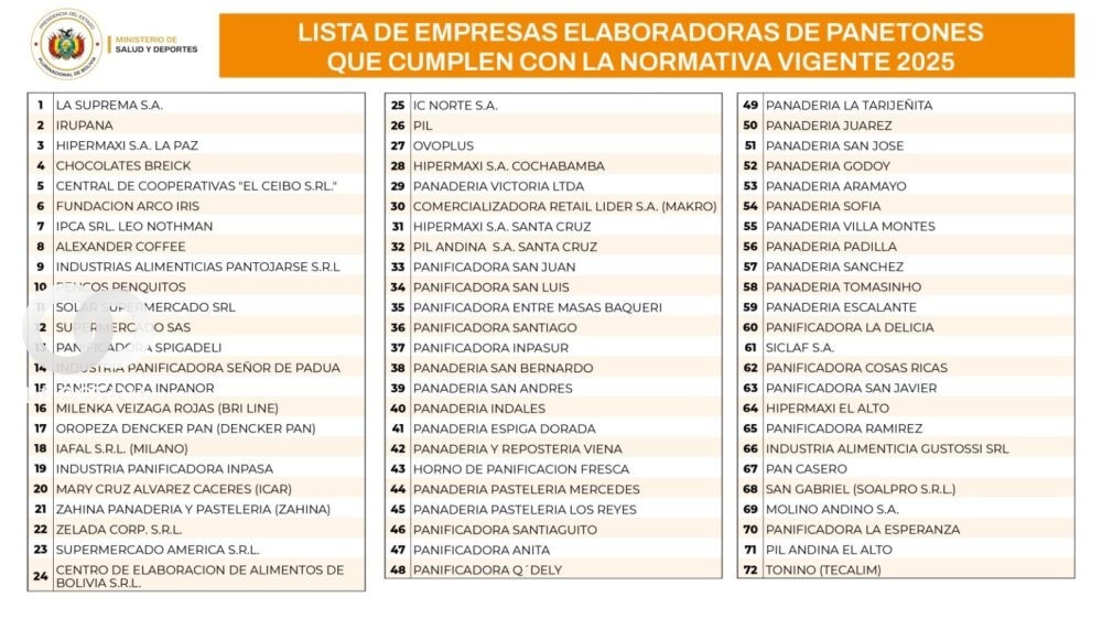 El Ministerio de Salud y Deportes presentó la lista oficial de empresas que cumplen con la Norma Boliviana NB 39007/2012, que prohíbe el uso de bromato de potasio en panetones. Durante la presente gestión, se analizaron 121 muestras de 74 empresas; 119 resultaron libres del aditivo y solo 2 dieron positivo, lo que evidencia un cumplimiento del 99% y una disminución sostenida en el uso de compuestos peligrosos.