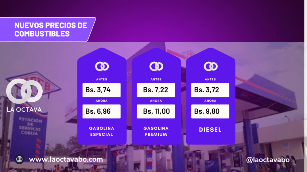 Con el Decreto, la gasolina especial pasa a costar 6,96 bolivianos por litro, el diésel 9,80 bolivianos y la gasolina premium 11 bolivianos. También se ajustan los precios de los combustibles de aviación y derivados, mientras que el GLP mantiene su precio de 22,50 bolivianos por garrafa.