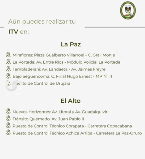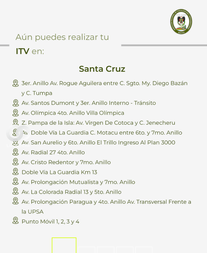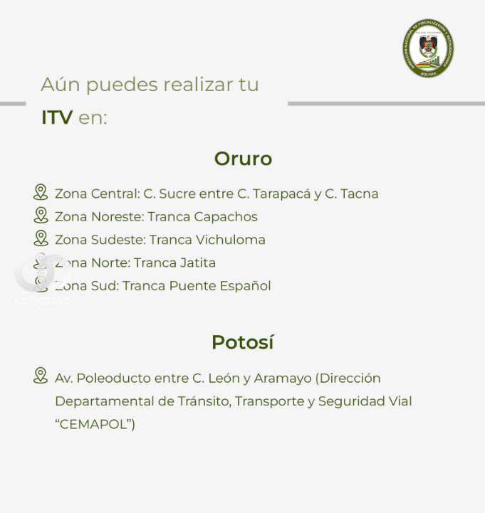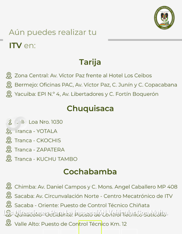 Sin embargo, toda ITV realizada fuera del plazo oficial estará sujeta a una multa de 100 bolivianos, conforme al Artículo 381° numeral 14 del Reglamento del Código Nacional de Tránsito, que establece sanciones por no presentarse a las inspecciones en los períodos señalados.
