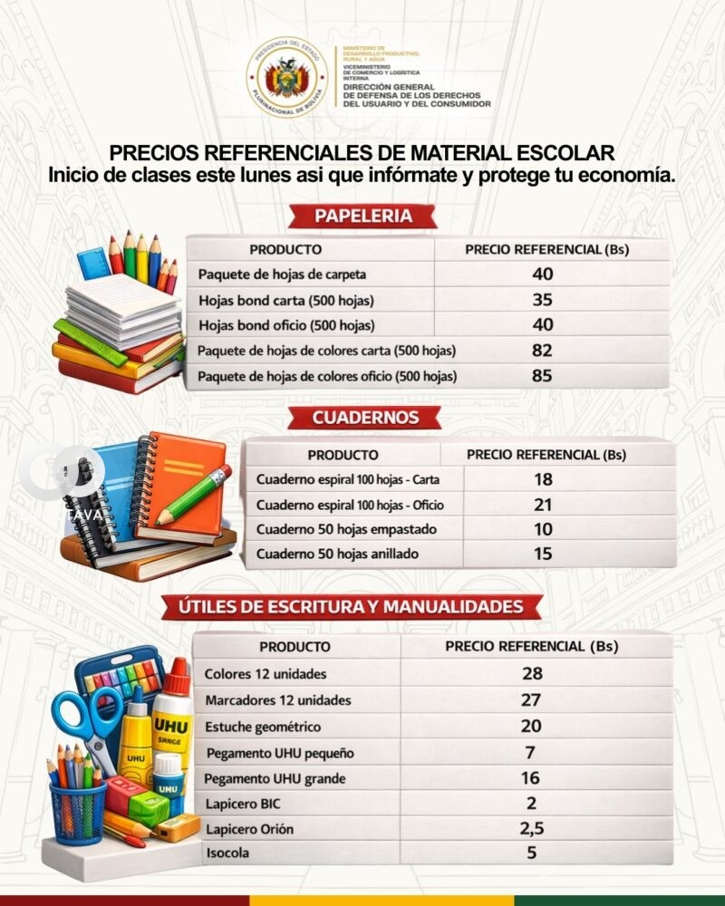 Entre los precios referenciales destacan: paquete de hojas de carpeta Bs 40, hojas bond tamaño carta Bs 35, hojas de colores Bs 82–85, cuadernos espiral de 100 hojas Bs 18–21, cuadernos empastados Bs 10, lápices BIC Bs 2, pegamento UHU Bs 6–17 y marcadores de 12 unidades Bs 27. El presidente Rodrigo Paz inaugurará la gestión escolar en la unidad educativa de Copacabana, La Paz, mientras estudiantes de todo el país retornan a clases.
