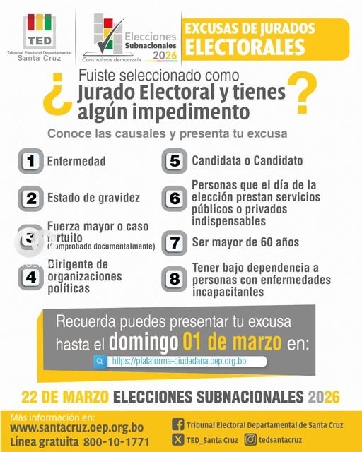 Este lunes 23 de febrero, el Tribunal Departamental Electoral de Santa Cruz informó las ocho causales que permiten excusarse como jurado electoral para las Elecciones Subnacionales 2026, previstas para el 22 de marzo. Las razones incluyen: