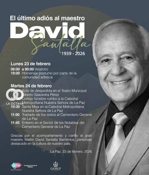 Este martes 24 de febrero, a las 09:30, se realizará la despedida oficial en el teatro y a las 10:00 partirá el cortejo fúnebre hacia la Catedral Metropolitana de Nuestra Señora de La Paz, donde se celebrará una misa de cuerpo presente a las 10:30. Posteriormente, a las 11:00, sus restos serán trasladados al Cementerio General, sector “Los Notables”, para su entierro.
