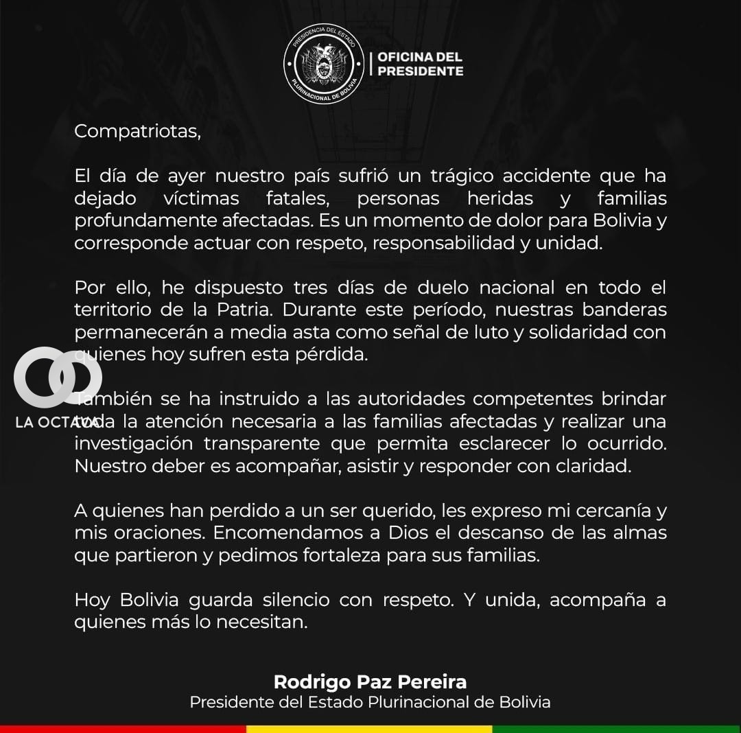 La autoridad calificó el hecho como un “momento de dolor para Bolivia” y exhortó a la población a actuar con respeto, responsabilidad y unidad frente a la tragedia. Asimismo, instruyó brindar atención inmediata a las familias afectadas.
