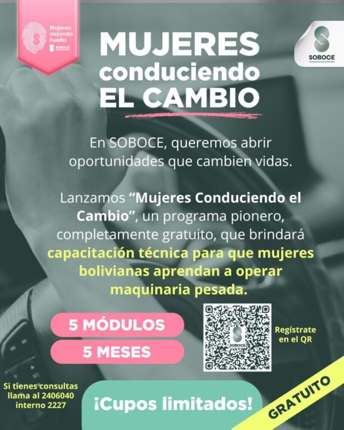 La Sociedad Boliviana de Cemento (SOBOCE) lanzó el programa “Mujeres conduciendo el cambio”, una iniciativa de formación técnica para capacitar a mujeres en conducción de vehículos de alto tonelaje y operación de maquinaria pesada, con el objetivo de aumentar su participación en la industria de la construcción. Las inscripciones abren el 8 de marzo, Día Internacional de la Mujer.