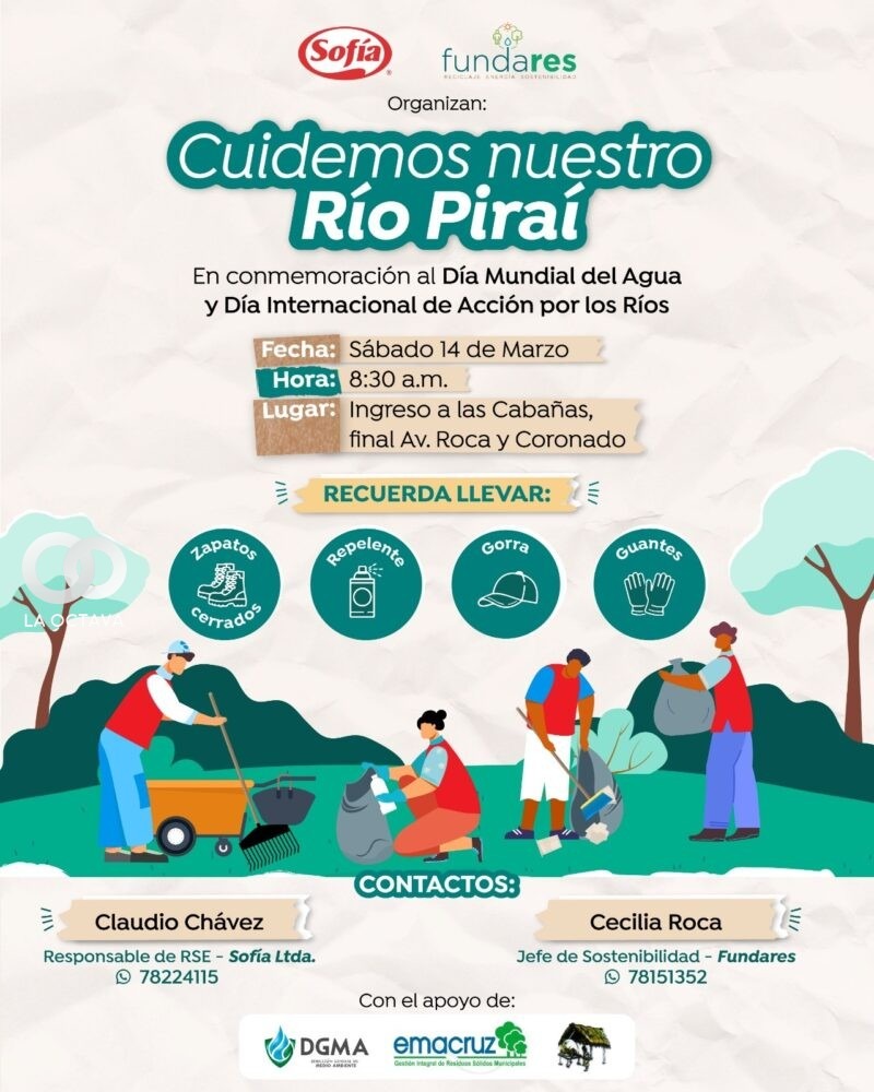 En el marco del Día Mundial del Agua y del Día Internacional de Acción por los Ríos, Fundares y Sofía Ltda. organizan la cuarta campaña de limpieza y sensibilización ambiental en las riberas del Río Piraí. La actividad se realizará el 14 de marzo, de 8:30 a 11:30, con punto de encuentro en el dique 1, con el objetivo de reducir microbasurales y promover el cuidado de los recursos hídricos.