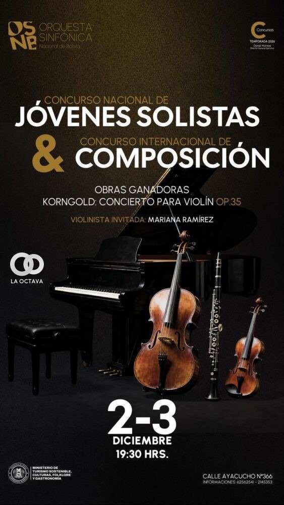 La Orquesta Sinfónica Nacional de Bolivia (OSNB) lanzó dos concursos para impulsar el talento musical: el I Concurso Nacional de Jóvenes Solistas y el I Concurso Internacional de Composición. El primero está dirigido a músicos bolivianos de hasta 35 años, residentes dentro o fuera del país, y permitirá al ganador presentarse junto a la OSNB en conciertos oficiales en diciembre de 2026. La participación puede ser virtual o presencial, con inscripciones abiertas hasta el 2 de mayo y audiciones presenciales el 23 de junio en La Paz.