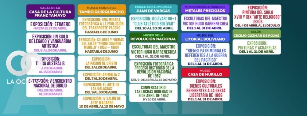 Durante abril, los Museos Municipales de La Paz presentan una completa agenda de exposiciones que acercan a la ciudadanía al arte, la historia y el patrimonio desde diversas perspectivas. La programación incluye muestras contemporáneas, recorridos históricos y exhibiciones patrimoniales que reflejan la identidad paceña.