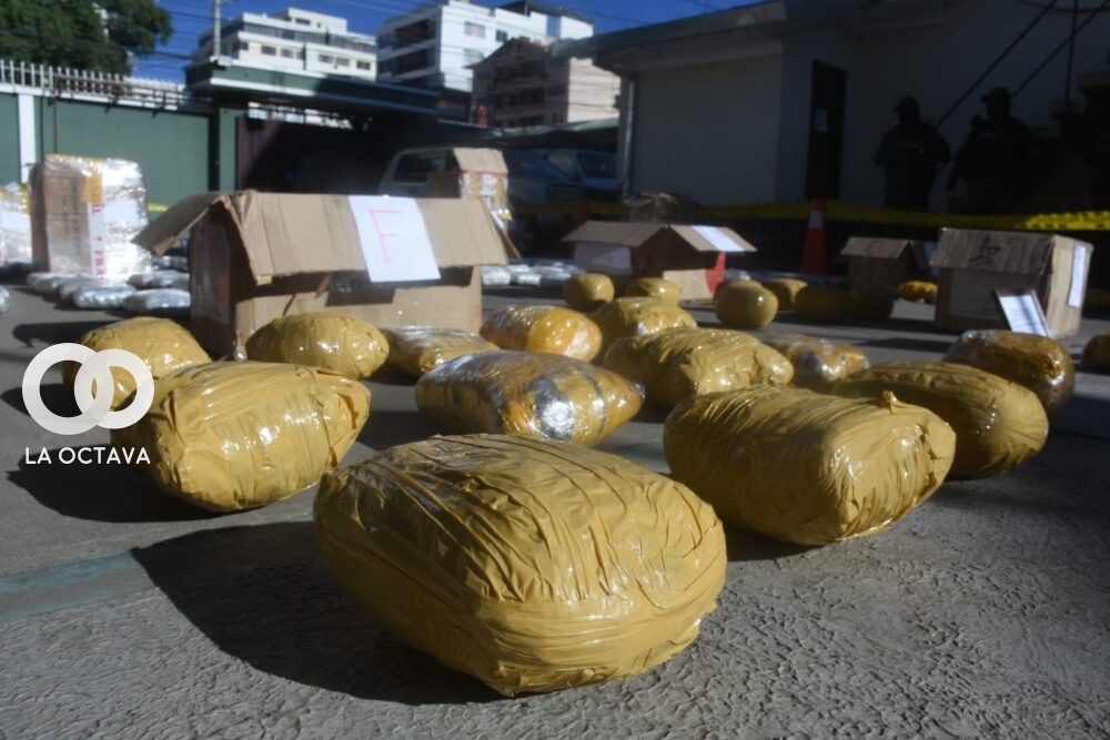 Asimismo, Alexander Barrientos, Director Departamental de la Felcn, informó que se trató de dos operativos en los que la dupla K9 identificó la droga, que se encontraba envasada al vacío y distribuida en seis cajones.