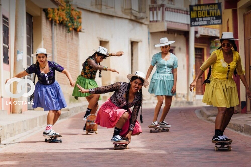 La obra muestra a cholitas skaters de Cochabamba como símbolo de identidad y resistencia cultural.