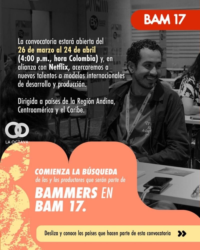 El Bogotá Audiovisual Market (BAM), programa de Proimágenes Colombia y la Cámara de Comercio de Bogotá, abrió la convocatoria para BAMMERS, iniciativa orientada a la formación y proyección de nuevos productores audiovisuales en la región. La postulación estará habilitada del 26 de marzo al 24 de abril de 2026.
