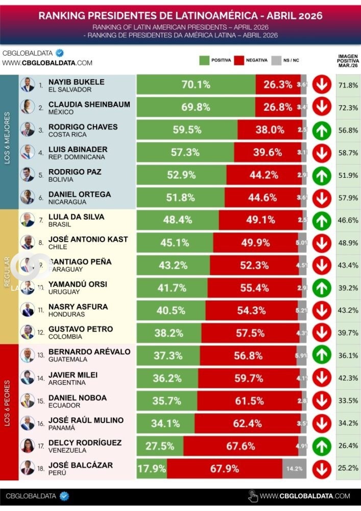 De acuerdo con los datos, el 33,1% de los encuestados califica su gestión como “muy buena” y el 19,8% como “buena”. En la región, el primer lugar lo ocupa Nayib Bukele (El Salvador), seguido por Claudia Sheinbaum (México), Rodrigo Chaves (Costa Rica) y Luis Abinader (República Dominicana).