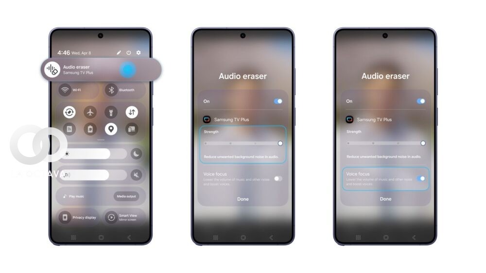 La función permite reducir ruidos de fondo y mejorar la claridad de la voz mediante controles como “Intensidad” y “Enfoque de voz”, accesibles desde el panel rápido del dispositivo. Además, el sistema puede separar el audio en seis capas —voz, música, viento, naturaleza, multitud y otros sonidos— para una personalización más precisa.