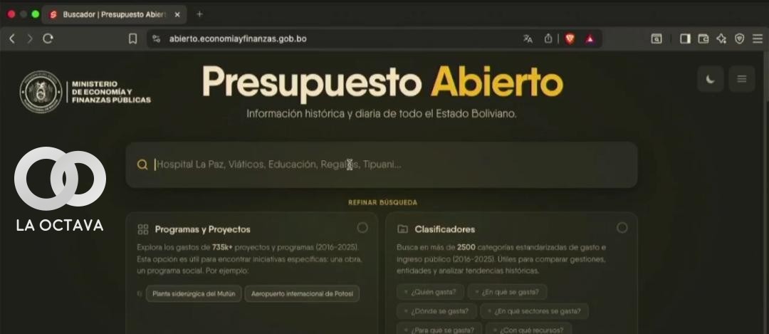 Este martes 21 de abril, José Gabriel Espinoza Yáñez, Ministro de Economía y Finanzas Públicas presentó un buscador presupuestario que permitirá a la ciudadanía acceder de forma simple y transparente a información sobre ingresos, gastos y proyectos del Estado. El Ministro señaló que la herramienta busca transparentar el uso de los recursos públicos y facilitar su fiscalización.